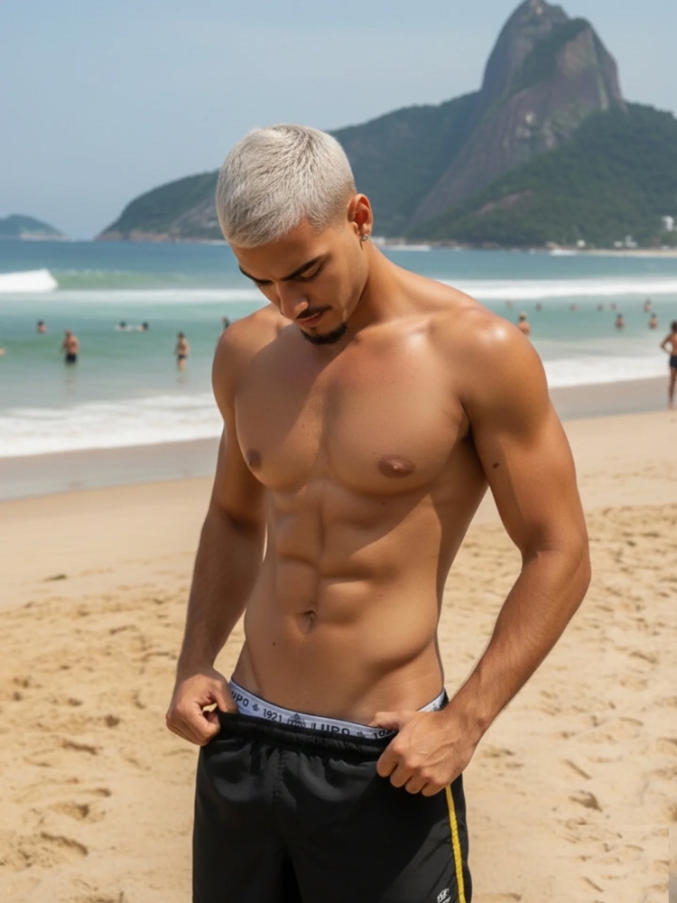 sem camisa, ressaltando sua boa forma e