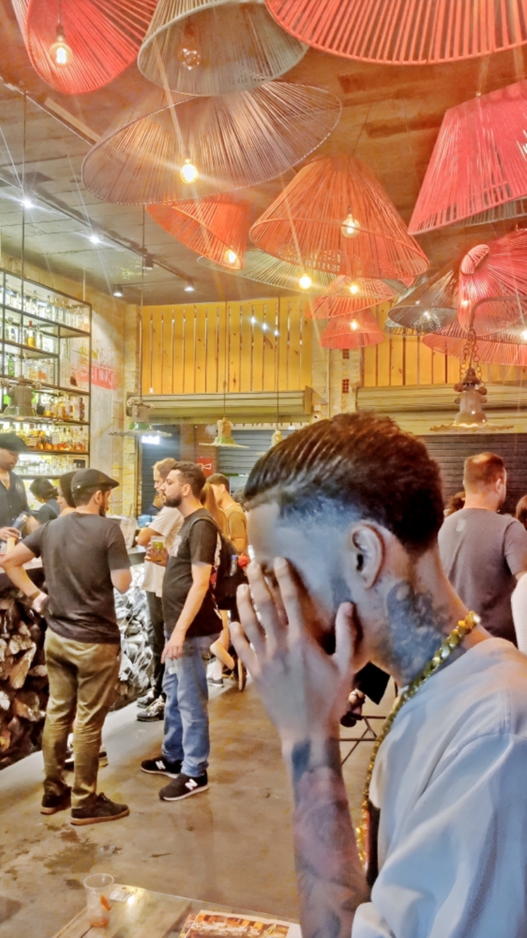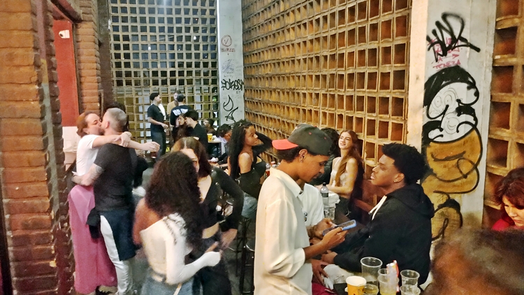 celebração urbana, com bares lotados, música ao